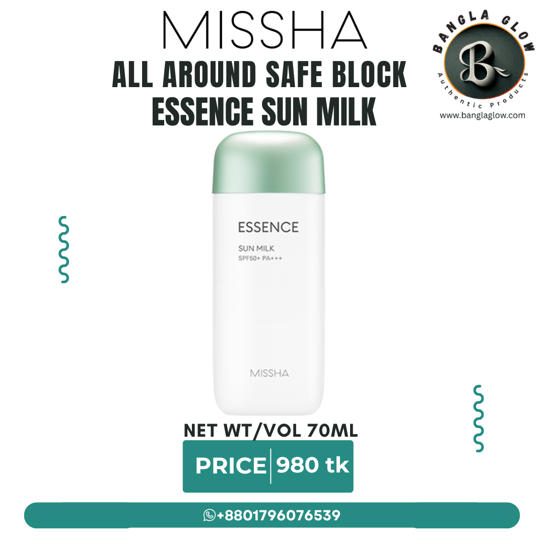 Missha All Around Safe Block Essence Sun Milk SPF50+ PA++++ একটি হালকা ও শীতল অনুভূতি দেয় এমন সান-জেল/মিল্ক ফর্মুলা, যা ত্বককে শক্তিশালী রূপে UVA ও UVB রশ্মি থেকে সুরক্ষা জানায়, পাশাপাশি গভীরতর হাইড্রেশন ও তাজা লুক বজায় রাখে।