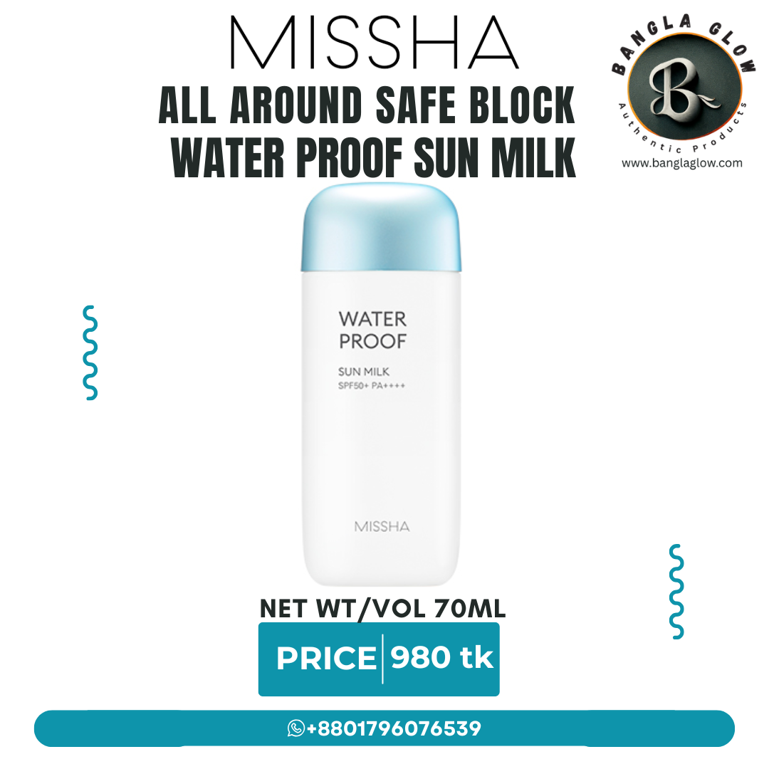 Missha All Around Safe Block Water Proof Sun Milk SPF50+ PA++++ এমন একটি সানস্ক্রিন যা শক্তিশালী সুরক্ষা দেয়, পানি ও ঘাম প্রতিরোধক এবং হালকা ফিনিশযুক্ত—ত্বককে থাকে সতেজ ও ফেরা।