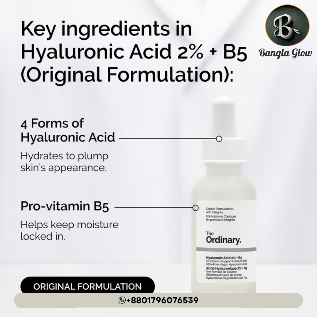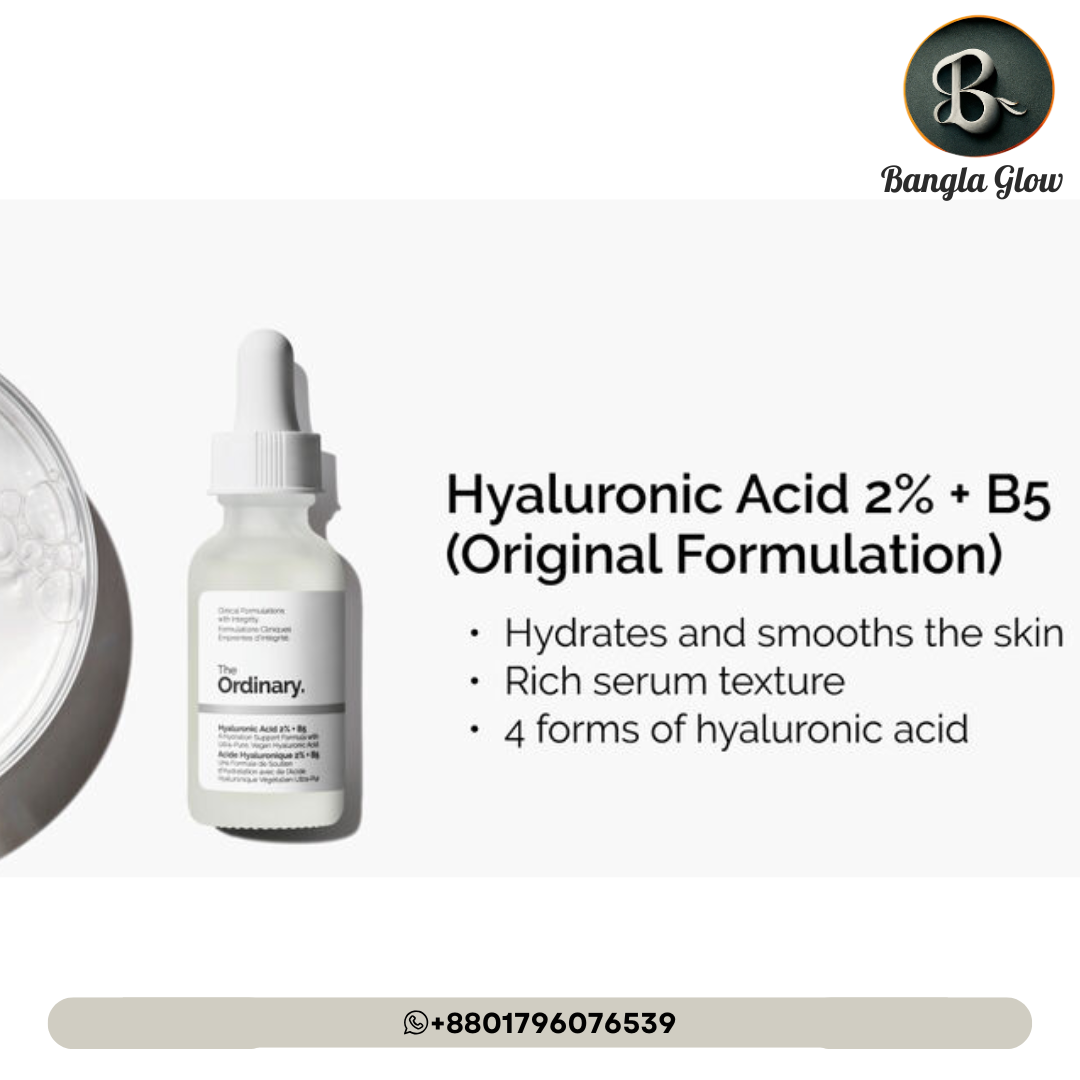 The Ordinary Hyaluronic Acid 2% + B5 (Original Formulation) একটি শক্তিশালী হাইড্রেটিং সেরাম, যা বিশেষভাবে শুষ্ক ও ডিহাইড্রেটেড স্কিনের জন্য উপকারী।